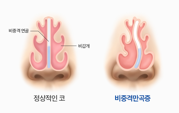 코 내부에 콧구멍을 둘로 나누는 격벽인 비중격이 틀어지면 숨을 쉬기 어렵거나 두통, 출혈, 수면 무호흡증 등 여러 증상을 유발합니다. 비중격만곡증 교정술은 이렇게 틀어진 비중격을 다시 교정해 주는 수술입니다.